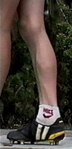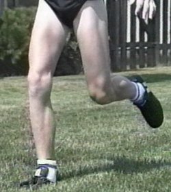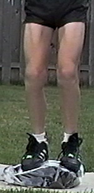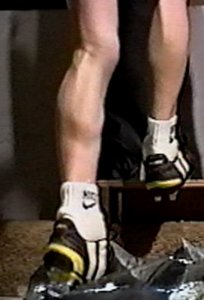 is flexing his calf to unbelievable size as he jumps up the step. Note