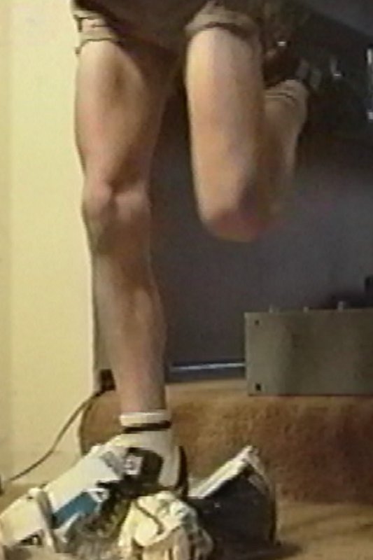 More runs. His right leg is taking the landing. You can see his calf muscle hardening in the step as he jumps off the box. |